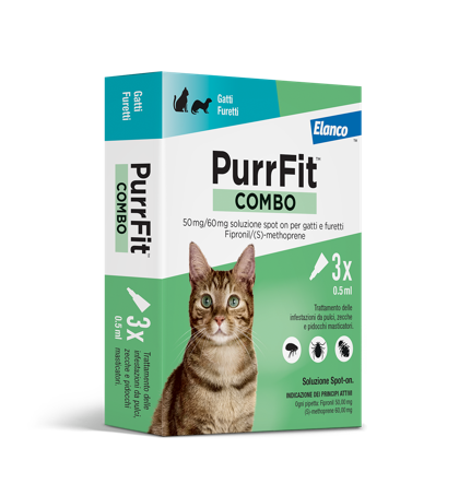 Purrfit Combo è un antiparassitario per uso topico (spot-on) che contiene due principi attivi, Fipronil e (S)-methoprene, ed elimina pulci, zecche e pidocchi masticatori.
